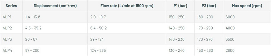 Conventional pressure: ALP1/ALP2 series supports 250-270 bar continuous pressure (peak 290 bar), ALP3/ALP4 series supports 230 bar continuous pressure (peak 270 bar).