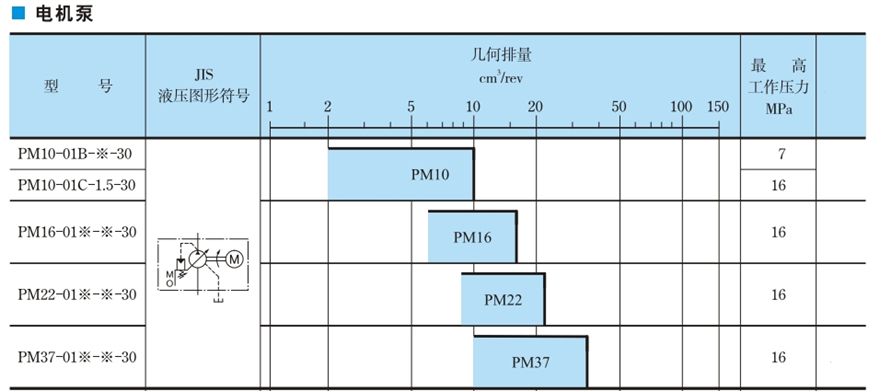 YUKEN motor pump: PM10, PM16, PM22, PM37.